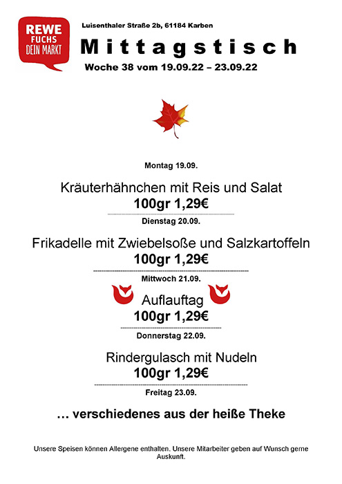 Hier finden Sie den aktuellen Download als PDF für unseren Mittagstisch vom 19. bis 23. September 2022 (KW 38 / 2022).