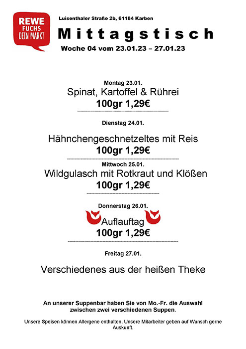 Hier finden Sie den aktuellen Download als PDF für unseren Mittagstisch vom 23. bis 27. Januar 2023 (KW04 / 2023).